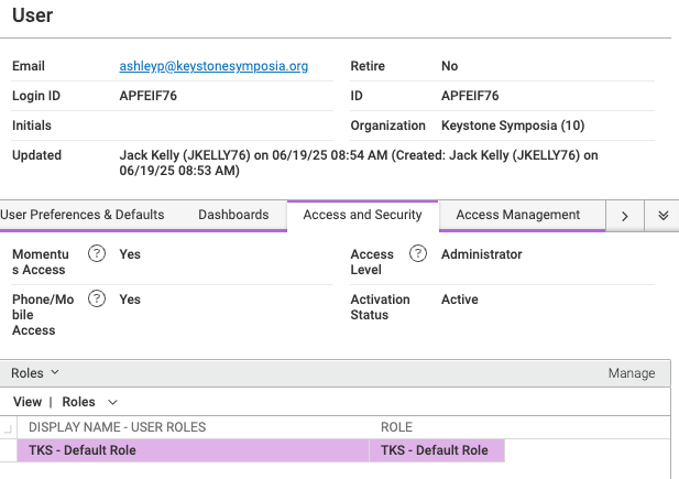 Verify that the user is assigned the TKS - Default role in the access and security tab
